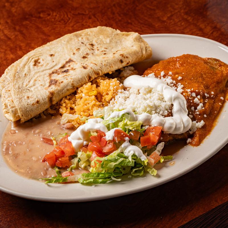 Three enchiladas with choice of red or green sauce and choice of chicken or cheese. With a side of rice, beans and topped with salad.