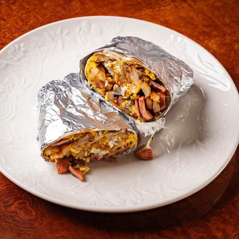 Burrito stuffed with a choice of protein, cheese, potato, and eggs.